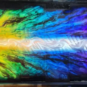 Each work is a unique original as DeRubeis uses structures and waves of light to build weightless, diaphanous forms. Colors flow seamlessly from one hue to the next, while the transparency of his layers of paint creates the illusion of incredible depth.